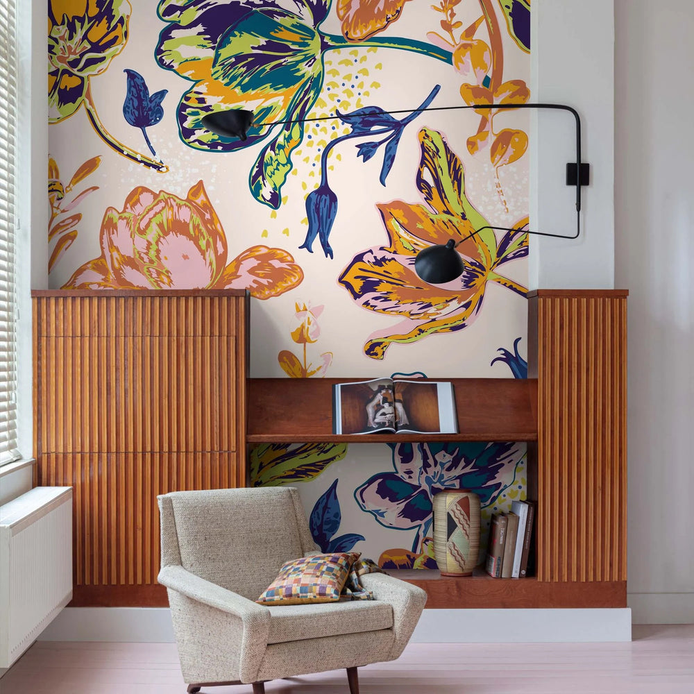 Hou je van een ruimte met pit, dan kun je kiezen voor krachtige, stoere kleuren zoals oranje, rood, groen of mosterd. Zo’n opgewekte mix haal je in huis dankzij de bloemen in waterverf van Honey. Het extravagante boeket van Wild Flowers of de statement bladeren van Colored Leaves behang stelen de spotlights op een lichte achtergrond.